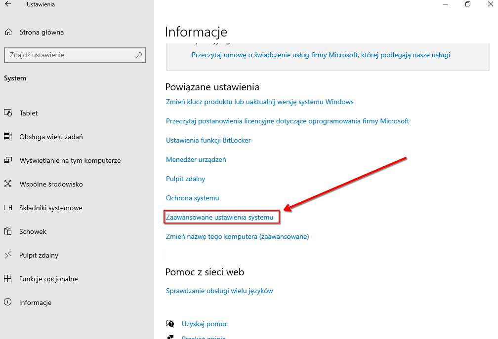 W sekcji Powiązane ustawienia znajdź link Zaawansowane ustawienia systemu.