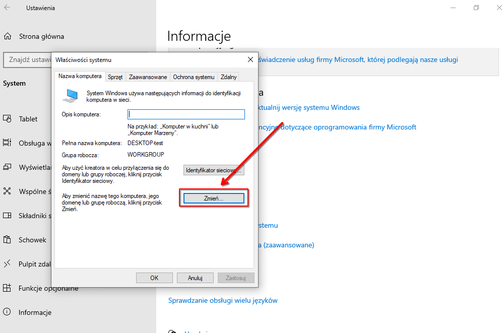 Po kliknięciu Zmień… otworzy się okno Zmiany nazwy komputera/domeny.