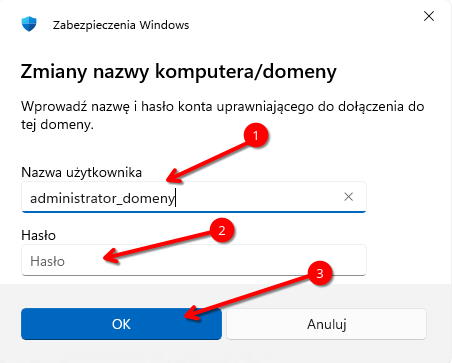 Po wpisaniu nazwy domeny i kliknięciu OK pojawi się okno Zabezpieczenia Windows – Zmiany nazwy komputera/domeny.
