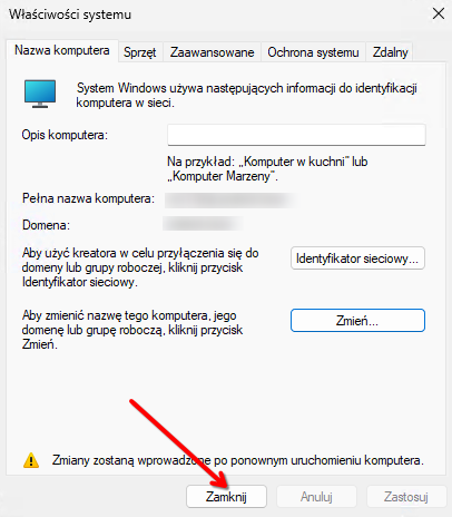 Wracasz do okna Właściwości systemu → Nazwa komputera.