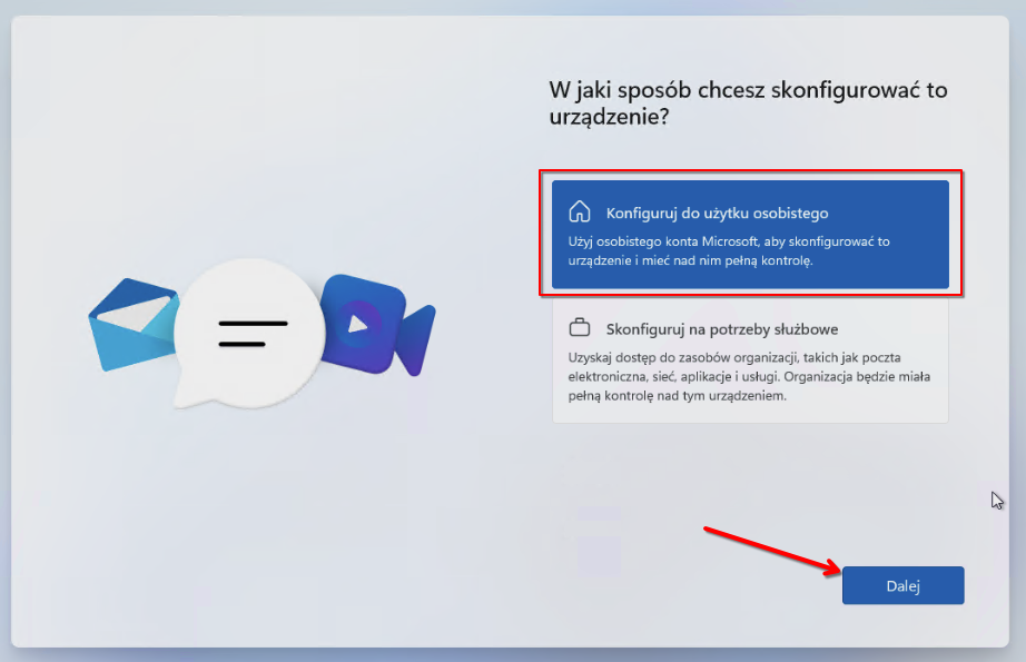 Wybierz Konfiguruj do użytku osobistego i kliknij Dalej.