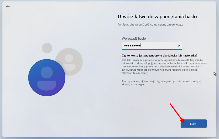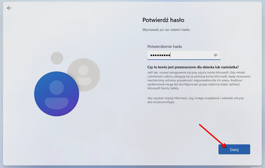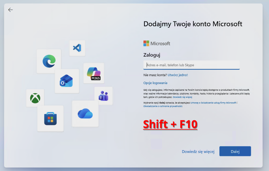 Na ekranie „Dodajmy Twoje konto Microsoft”, gdzie system wymaga wprowadzenia adresu e-mail konta Microsoft, należy użyć skrótu klawiaturowego.