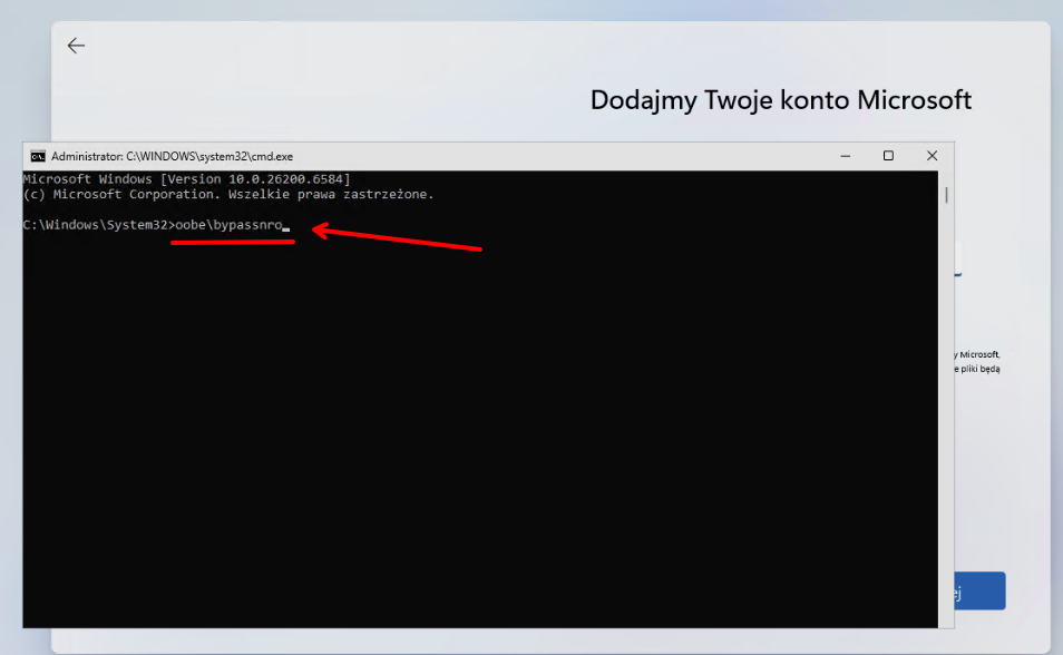 Po otwarciu Wiersza polecenia na ekranie „Dodajmy Twoje konto Microsoft” należy wprowadzić odpowiednią komendę.