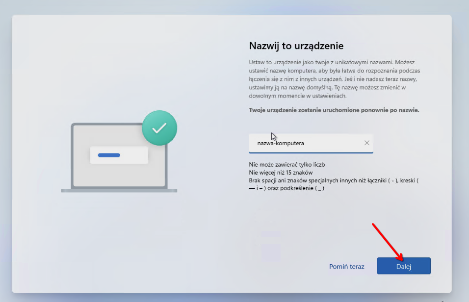 Możesz wpisać nazwę komputera i kliknąć Dalej,