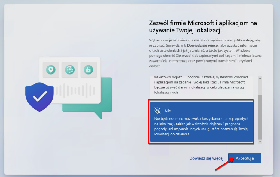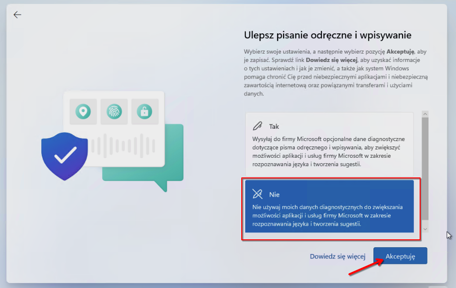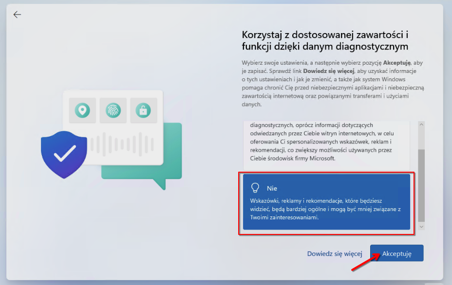 Wybierz Nie (rekomendowane) i kliknij Akceptuję.
