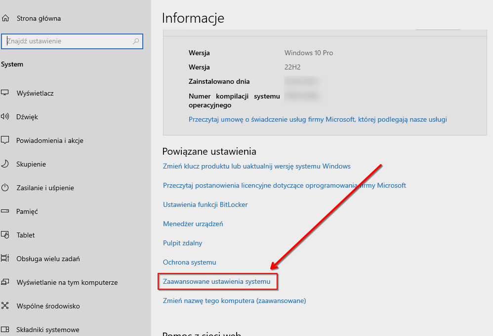 W sekcji Powiązane ustawienia kliknij Zaawansowane ustawienia systemu.
