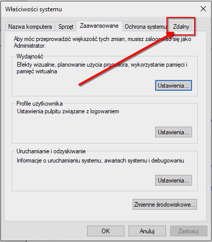 W oknie Właściwości systemu przejdź do zakładki Zdalny.
