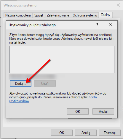 W oknie Użytkownicy pulpitu zdalnego kliknij przycisk Dodaj….