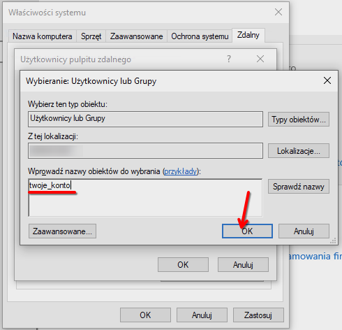 W oknie Wybieranie: Użytkownicy lub Grupy wpisz nazwę użytkownika
