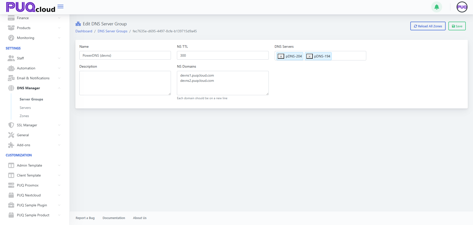 When you create/edit a zone, PUQcloud writes changes to all servers in the selected group.