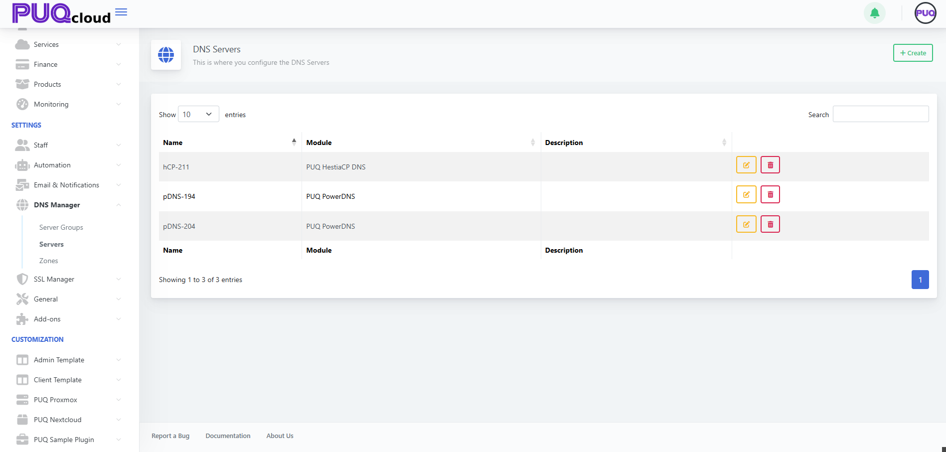 In Servers you connect your real DNS servers to PUQcloud. Then you attach these servers to Server Groups, and groups power your Zones (create/update records, reload zones, import/export).